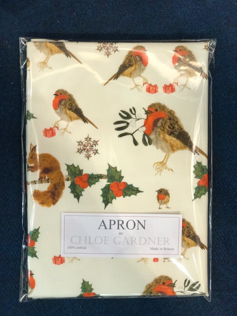 A cotton apron in Chloe’s Christmas Robin repeat design