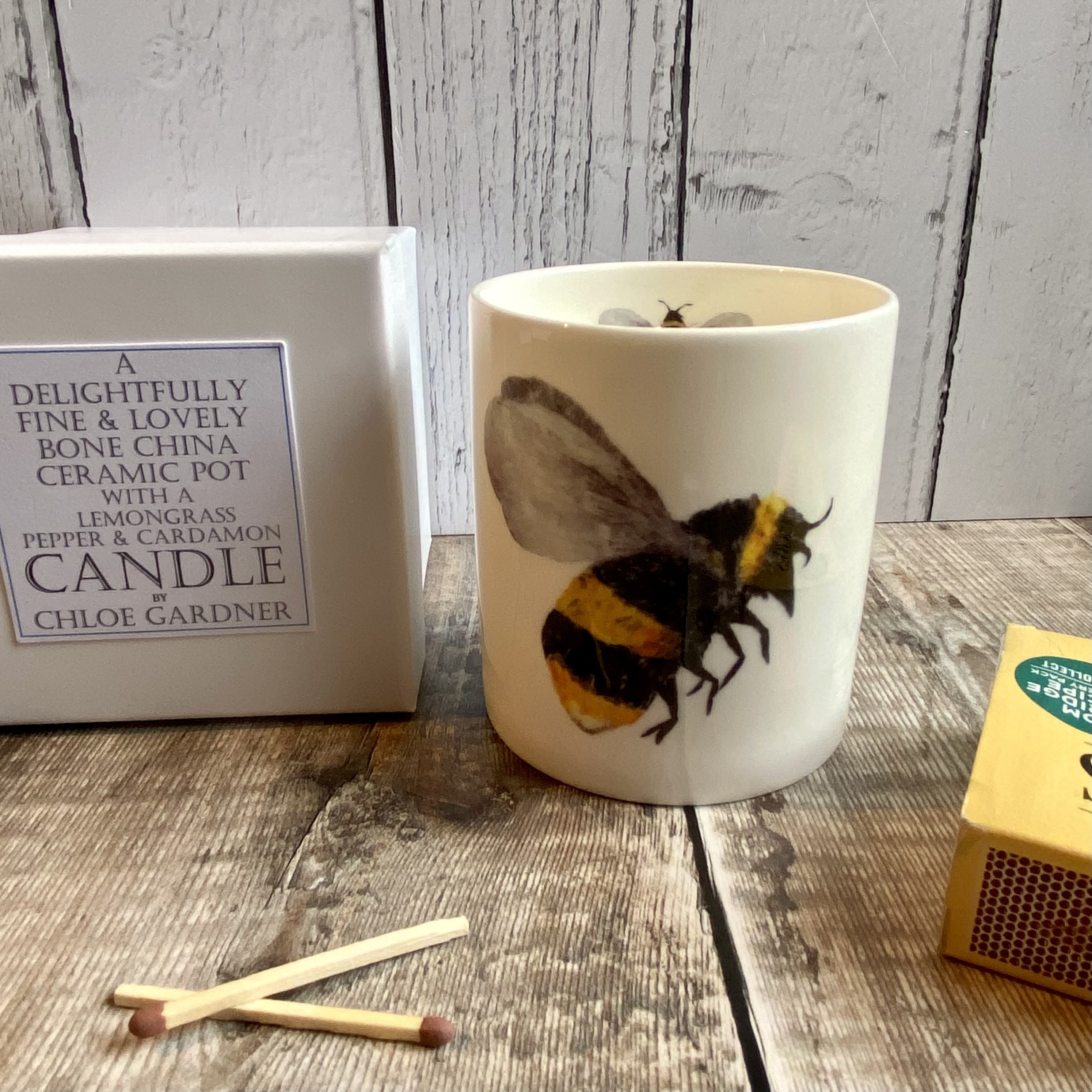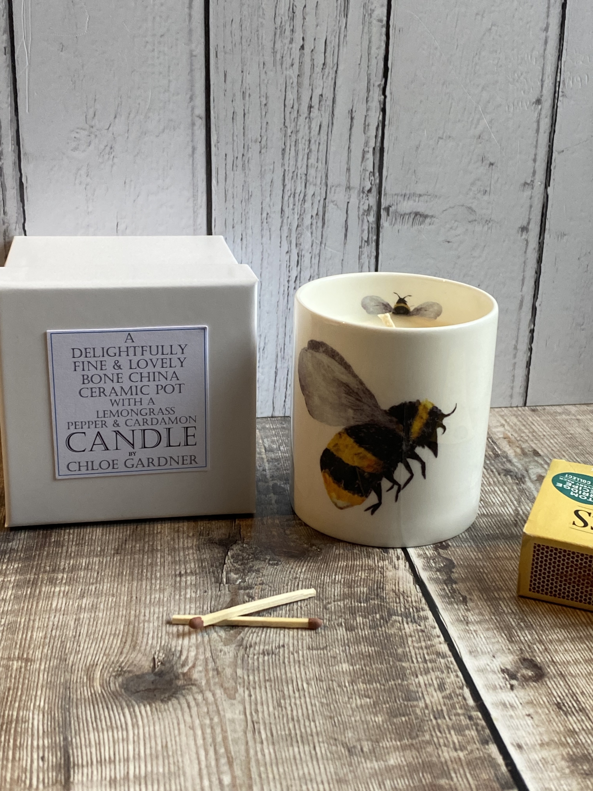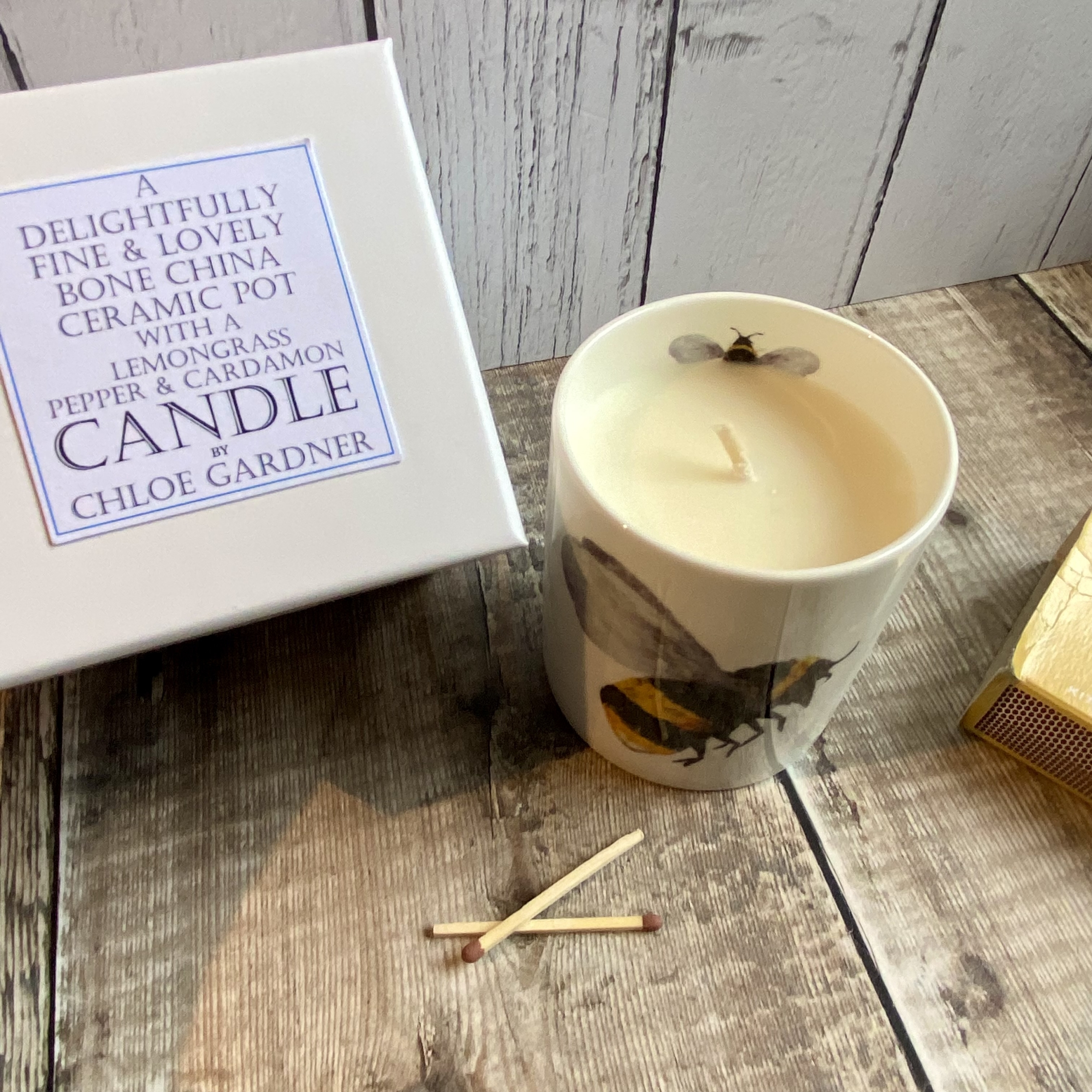 Bee Hand poured Candle in a Fine Bone China Jar with our feather Bee design.
