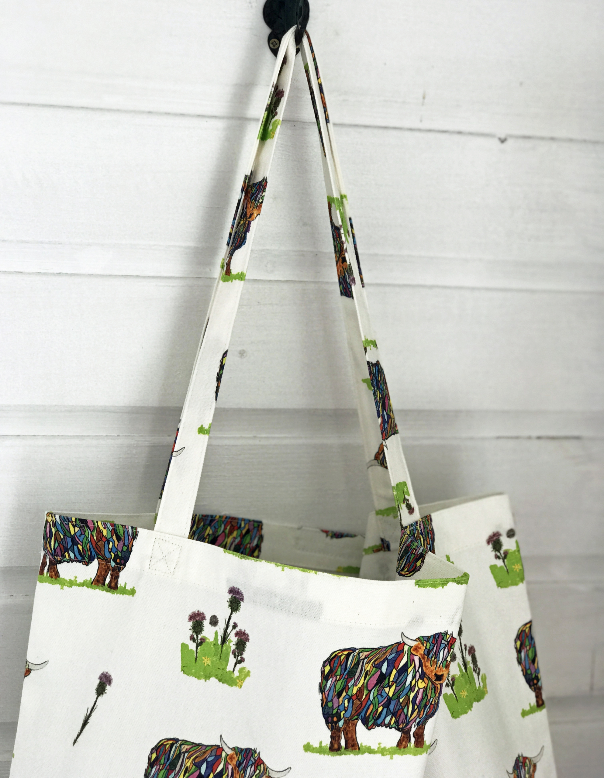 Strong canvas bag in a highland cow and thistles design and with a 10cm gusset.