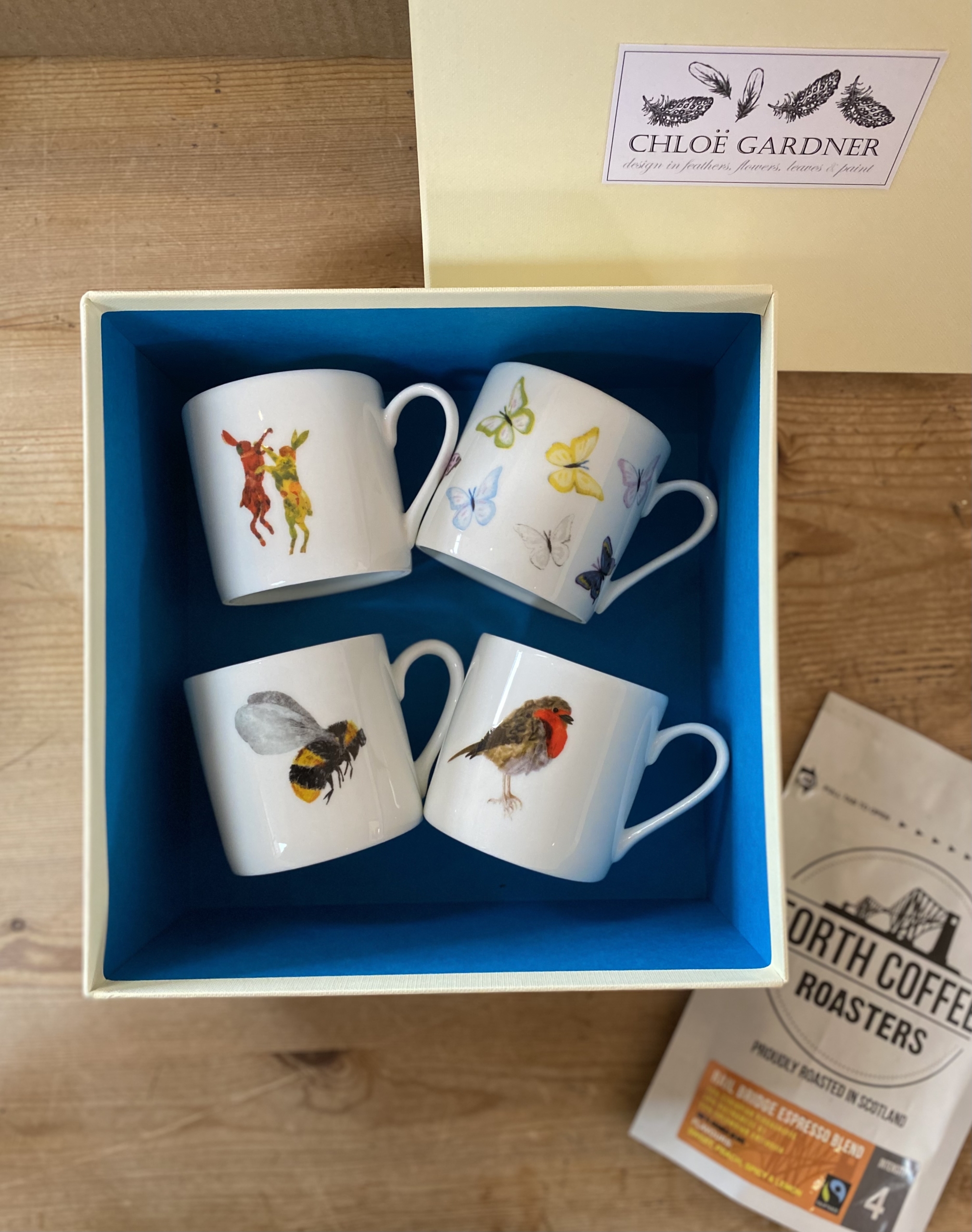Coffee Gift set featuring a bag of Forth Coffee Roasters Espresso Coffee and four Espresso mugs: Robin, Butterflies, Autumn Leaf Boxing Hares and Bee (wings apart)