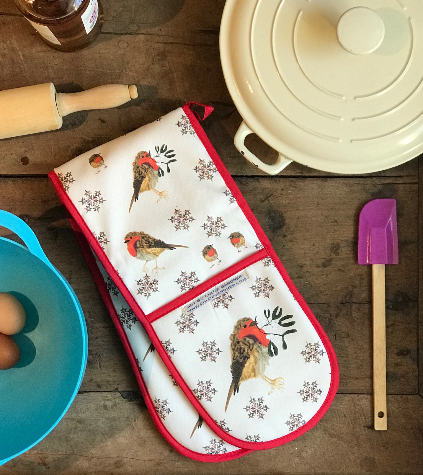 Oven gloves in Christmas Robin design fabric.