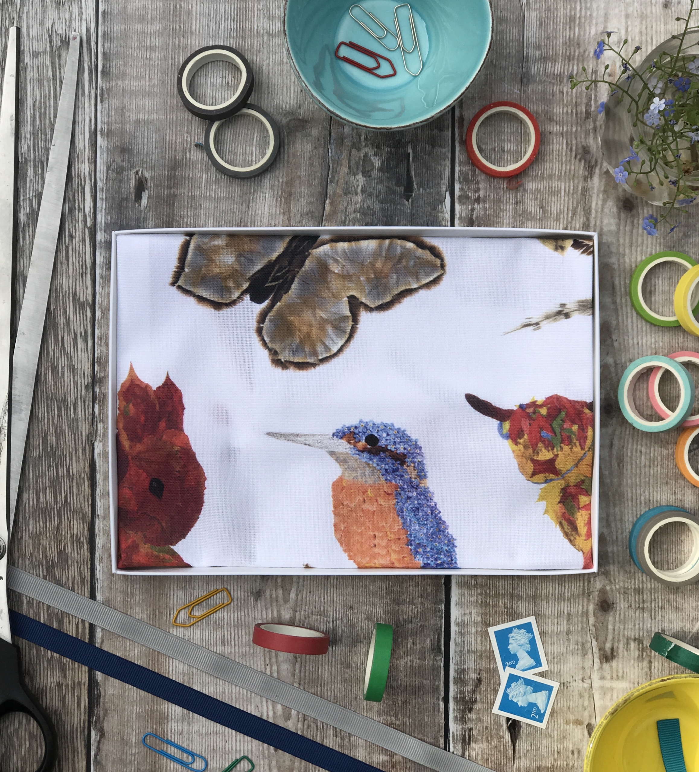 The process our end: The tea towel is printed and sewn in England. It arrives to us flat in a bag which holds 50 of the same design. Amazing Fran folds each tea towel for me – each design folded in a special way to show a key part on the top. The boxes are cut out of card somewhere else in the UK too and arrive flat. Elika folds the boxes and she puts in our box lining. We print stickers for the top of the box locally to us in Edinburgh and once Chloe has collected everything we put all these elements together to make this beautiful boxed top quality tea towel! I hope you like the look of it.