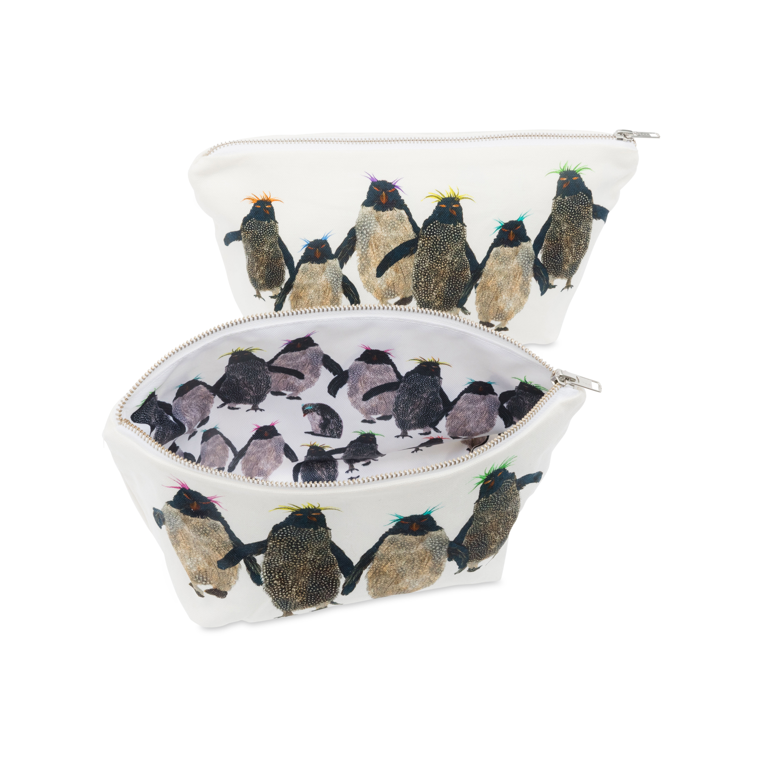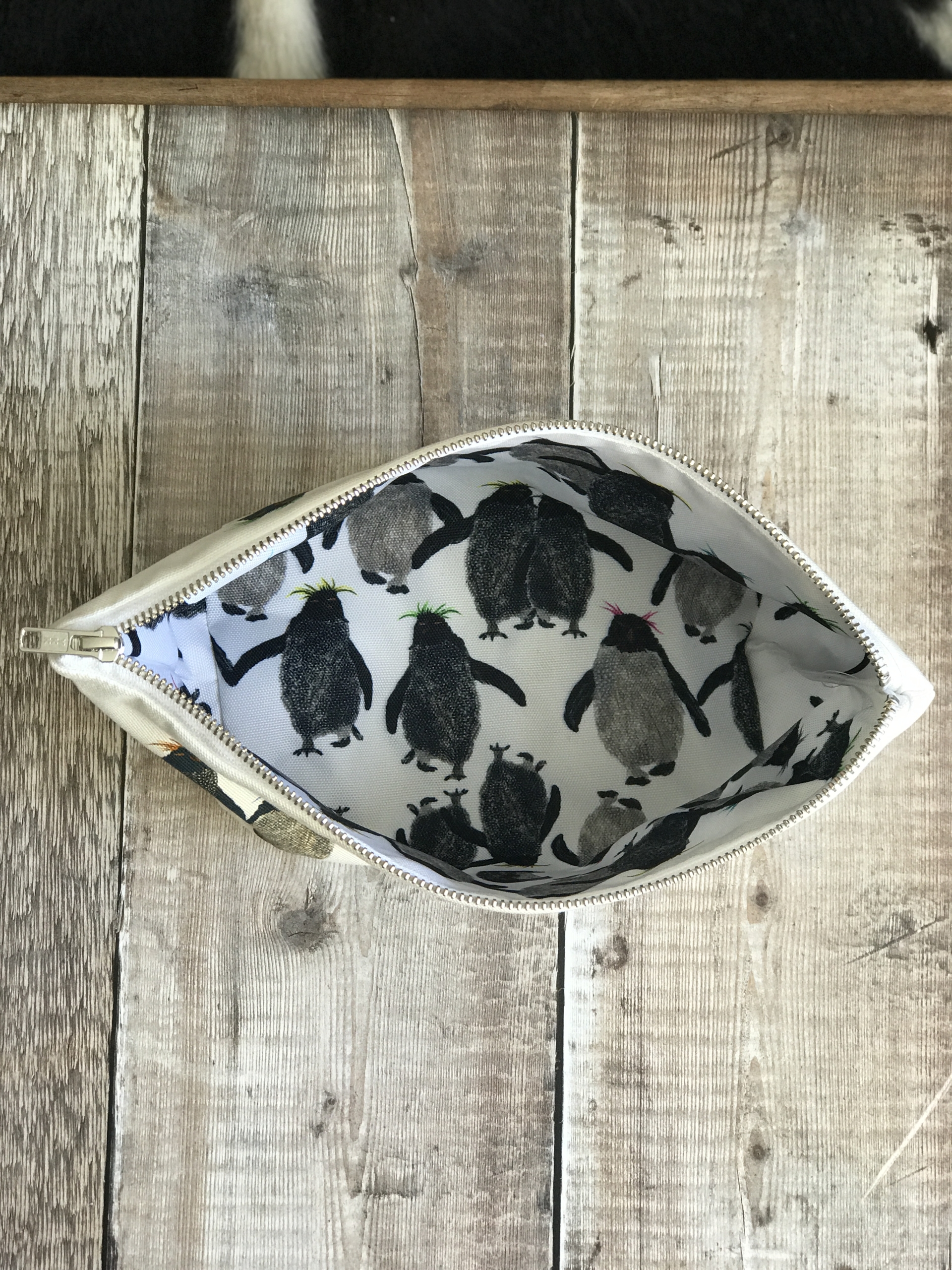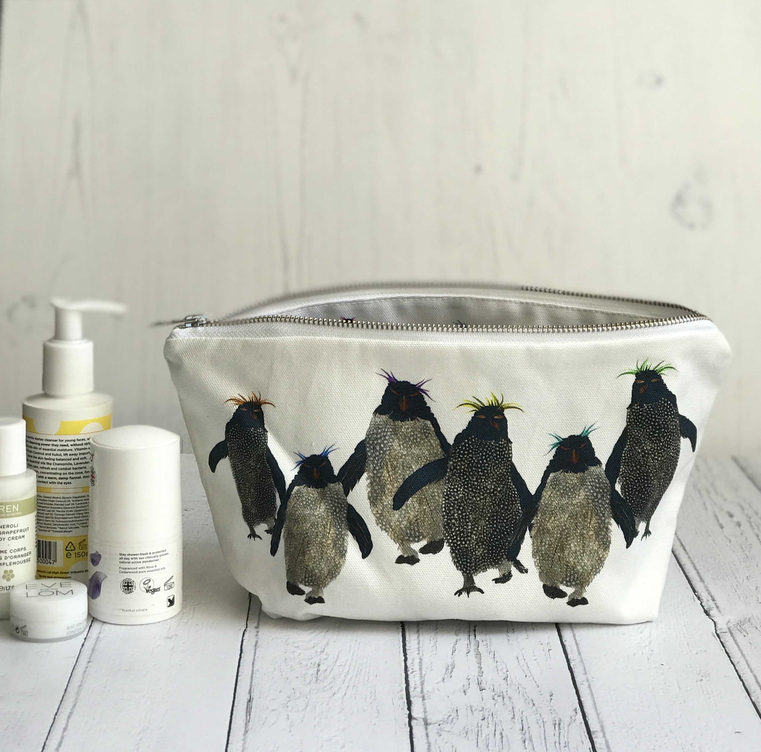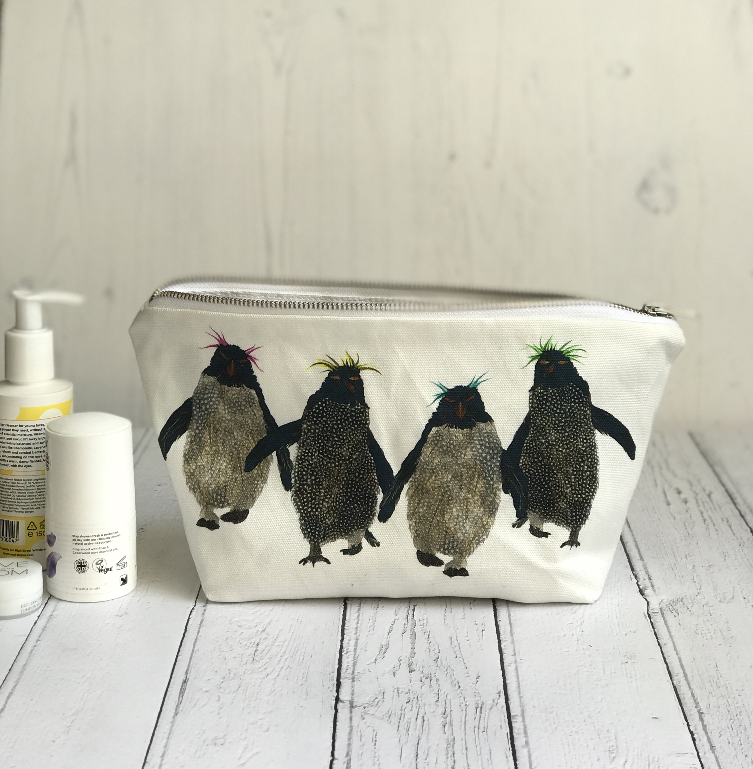 This is my rockhopper penguin wash bag with groups of fun and characterful rockhopper penguins on both sides of the bag. They are wacky and have coloured hair!